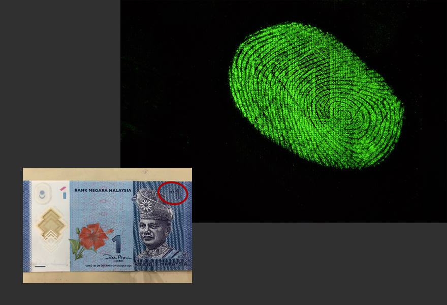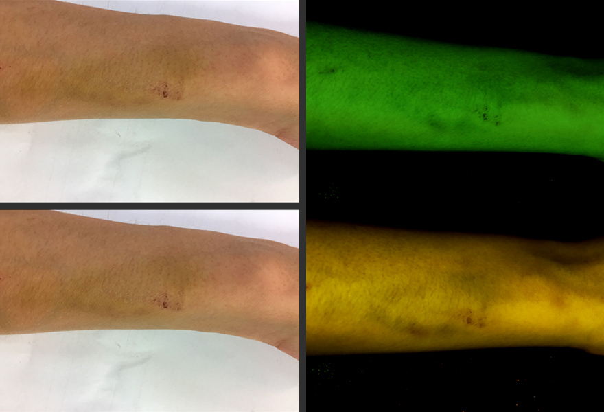 Searching for alien particles / scratch inspection on mask with pellicle. Comparison : (Upper) Under 4000K White Light can find dust; (Bottom) Under collimated green light can see other particles.