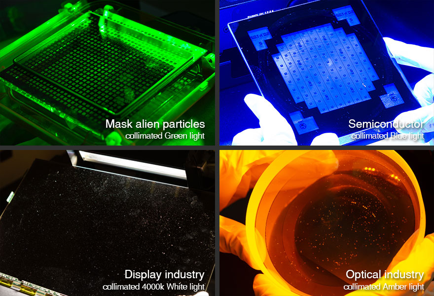 Inspectors could find sticky dust particles on LCD efficiently. Comparison: (Upper left) lens under ambient light ; (Upper right) lens under collimated 4000K white light seem unqualified.