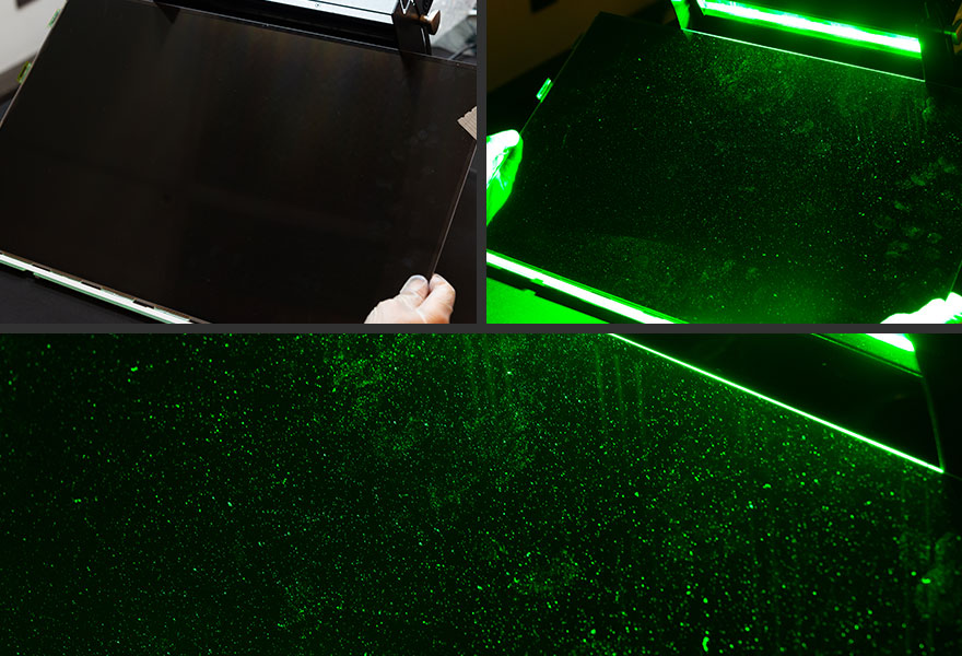 Inspectors could find sticky dust particles on LCD efficiently. Comparison: (Upper left) lens under ambient light ; (Upper right) lens under collimated green light unqualified.