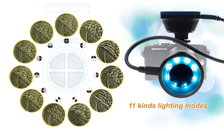 Lighting come in 11 modes, can be different adjustment for varying objects surface to get the best result of shooting.
